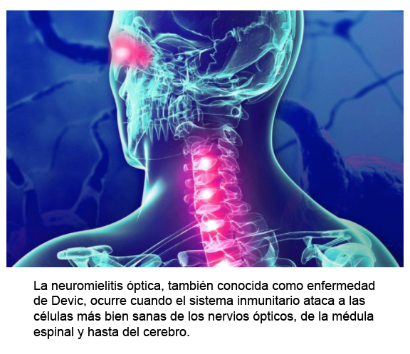 La neuro mielitis óptica también seconoce como «trastorno del espectro de la neuro mielitis óptica» o «enfermedad de Devic». Esta enfermedad se presenta cuando el sistema inmunitario del organismo reacciona contra sus propias células del sistema nervioso central, principalmente en los nervios ópticos y la médula espinal, aunque a veces también en el cerebro.